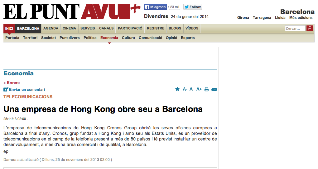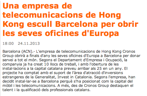 (…)Before the end of 2013 and backed by Invest in Catalonia, the office of the Catalan government to promote foreign investments in the regions, the Hong Kong communications company Cronos Group will open an office in the city of Barcelona.(…)